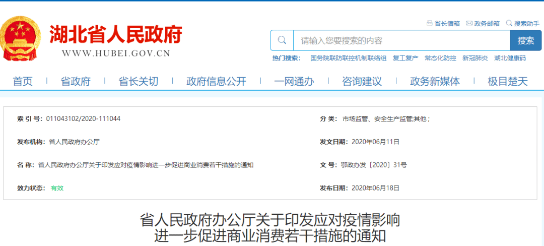 6月19日,湖北省人民政府官网发布了《应对疫情影响进一步促进商业消费若干措施》(以下简称《措施》)。一共25条,涉及降本减负纾困、营造消费环境以及优化监管服务等措施。