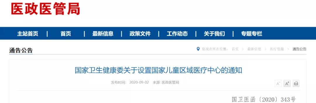 9月2日,国家卫健委发布《国家卫生健康委关于设置国家儿童区域医疗中心的通知》,决定在东北区域、华东区域、中南区域、西南区域、西北区域设置国家儿童区域医疗中心。