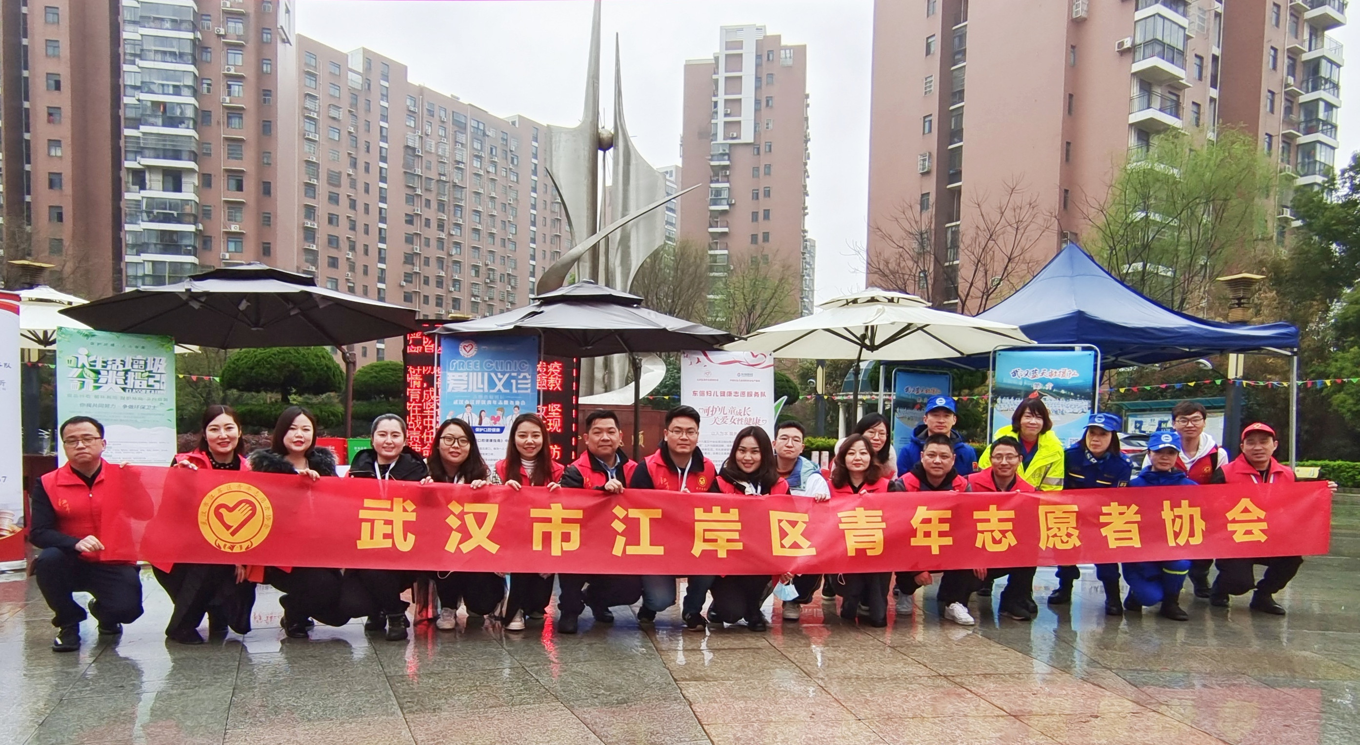 学雷锋纪念日当天,天空一直下着大雨,9游会官方网站医药青年志愿服务队的队员们提前来到服务社区,冒着大雨搭建为民服务健康咨询展台。