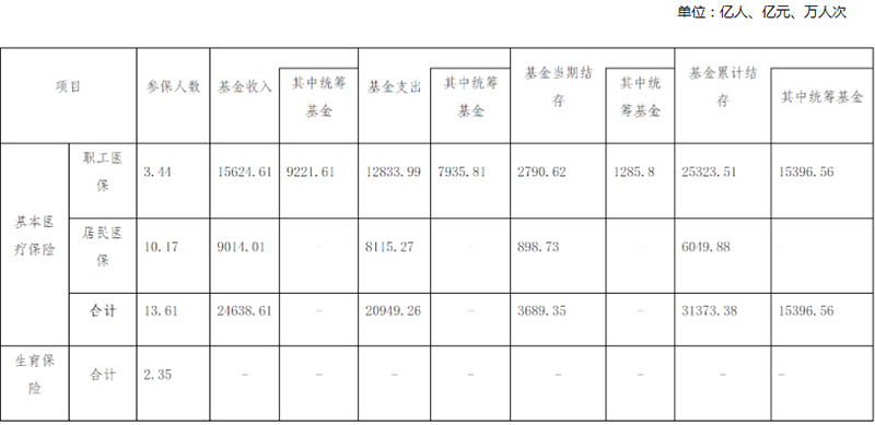 全年基本医疗保险基金(含生育保险)总收入、总支出分别为24638.61亿元、20949.26亿元,年末基本医疗保险(含生育保险)累计结存31373.38亿元[2]。