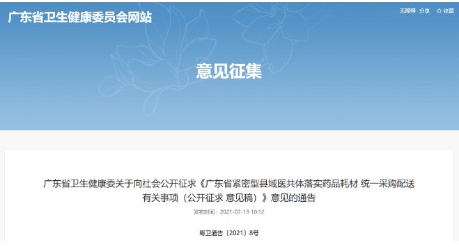 为提高县域医疗卫生资源配置和使用效率,7月19日,广东省卫健委官网发布《广东省紧密型县域医共体落实药品耗材统一采购配送有关事项(公开征求意见稿)》(以下简称《意见稿》),对其公开征求意见。这份仅有800余字的意见稿,字虽少但信息量大。