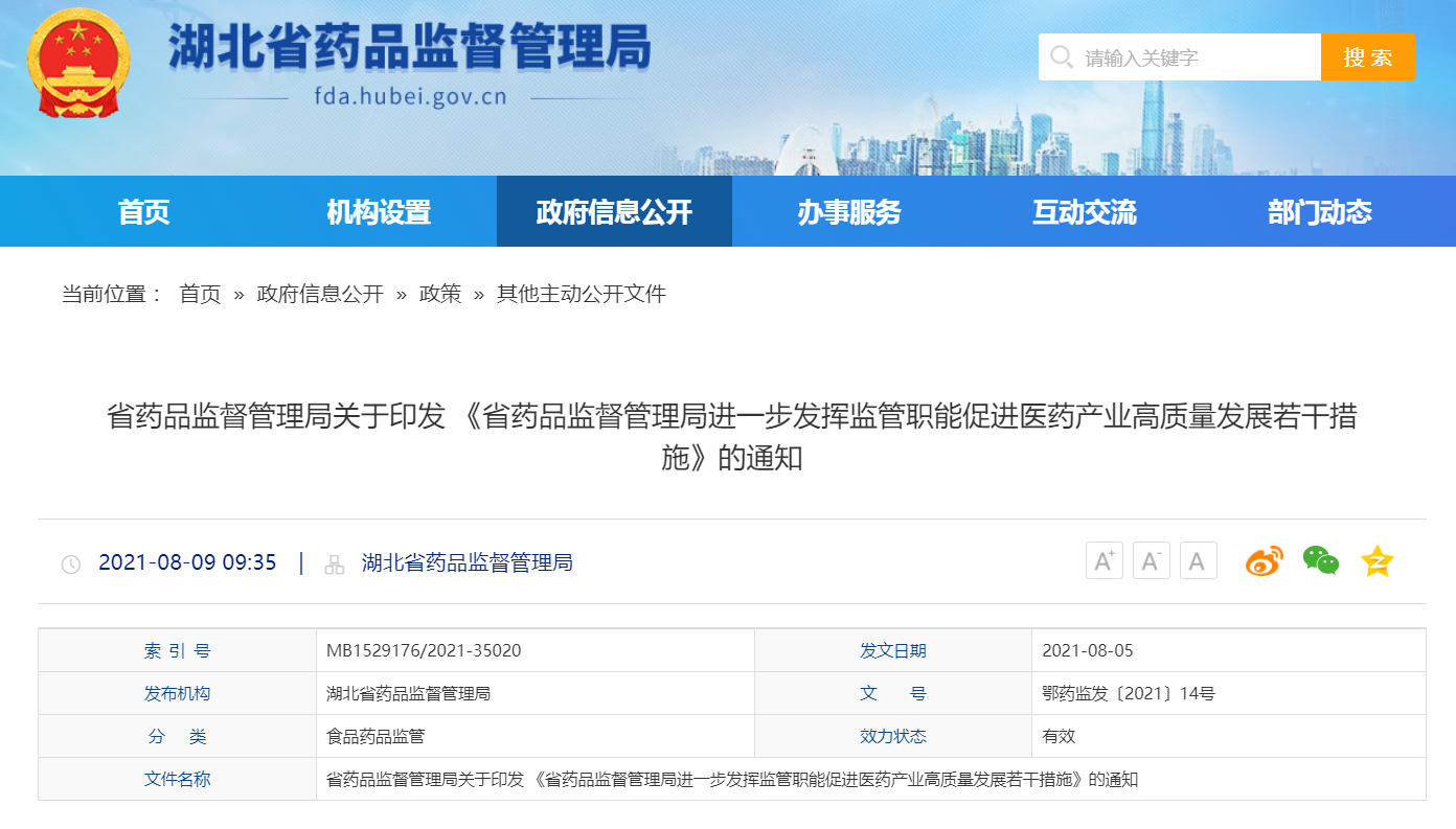 8月5日,湖北省药监局官网发布关于印发 《省药品监督管理局进一步发挥监管职能促进医药产业高质量发展若干措施》的通知,出台26项措施推动湖北省医药产业高质量发展。