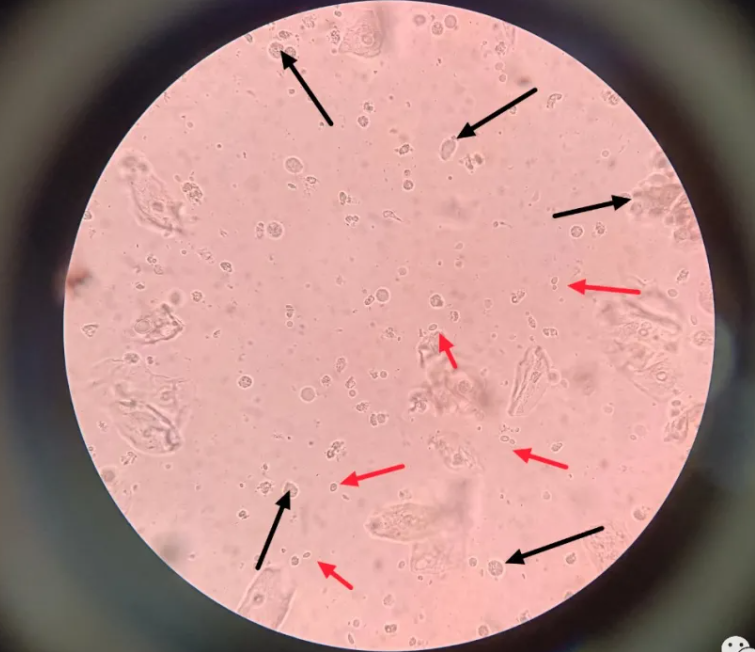 在显微镜下,最引人注意的是运动活泼的阴道毛滴虫(简称滴虫),见下图黑色箭头,但是旁边的白细胞并没有按常规出牌(增多),反而在正常范围内(平均一个视野6~8个白细胞),只能给清洁度打上Ⅱ度。出于日常检验工作的细心,再加上这种凝胶状白带不可能没有真菌,于是检验医生多看了几个视野,终于发现了零零散散的真菌(白色念珠菌),见下图红色箭头。