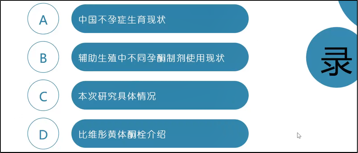 会议第二部分,由复旦大学附属中山医院生殖医学中心季晓薇教授进行《黄体酮栓和黄体酮软胶囊在激素替代FET周期的临床疗效比较》研究讲解,从中国不孕症生育现状、辅助生殖中不同孕酮制剂使用现状、本次研究具体情况、比维彤黄体酮栓介绍四个维度进行研究讲解。