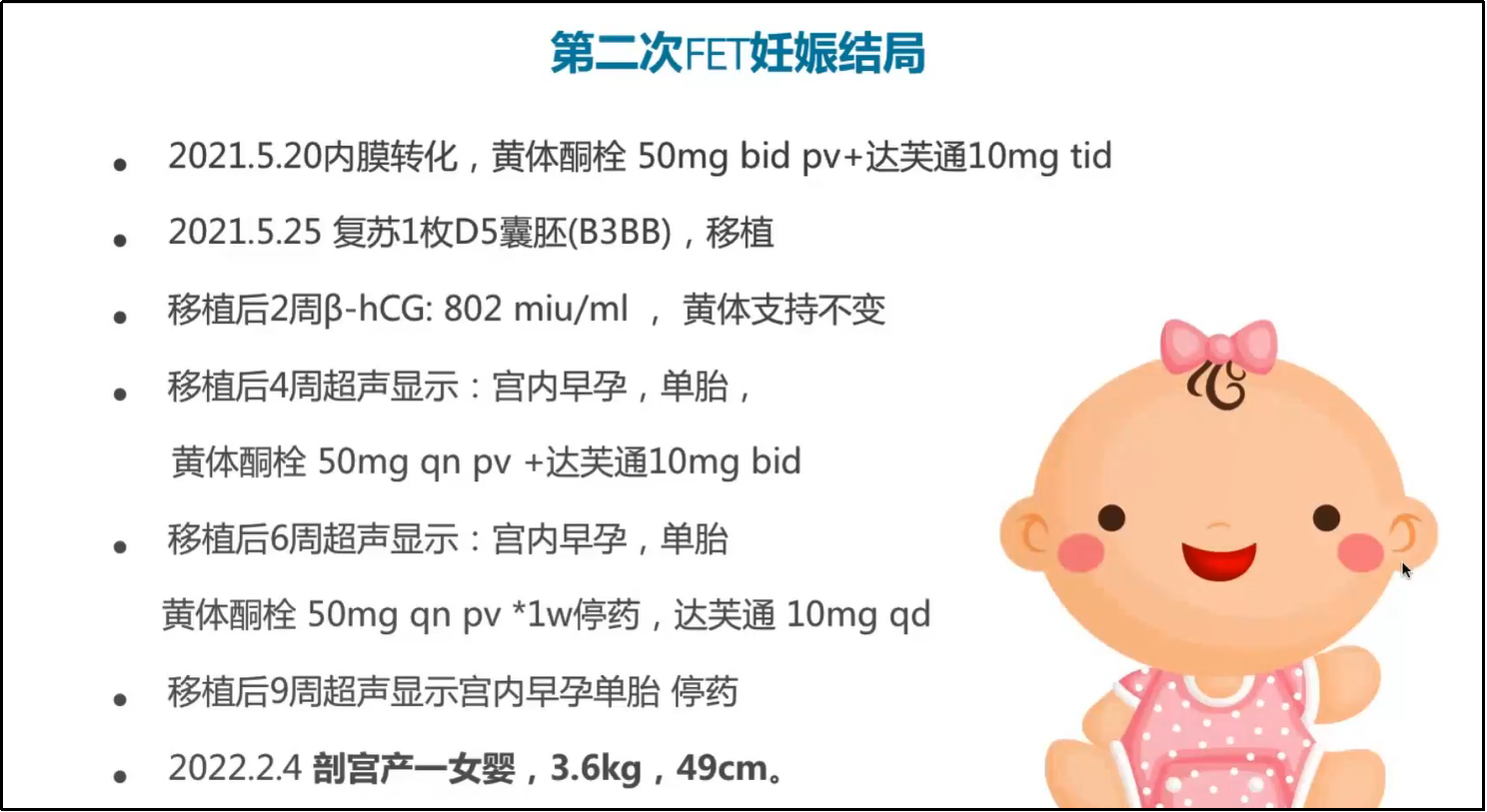 会议第三部分,由复旦大学附属中山医院生殖中心叶瑶教授进行临床案例解析,通过两步移植法及黄体酮栓不同阶段用药方案,有效解决患者生育需求,均达到较好妊娠结局。