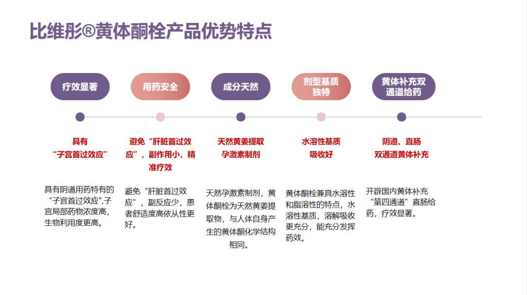 随后,高主任介绍了各类黄体支持药物的前世今生,并分别陈述各自的利弊:传统的黄体支持制剂包括口服剂和注射剂,但这两种剂型都具有局限性:口服制剂虽然使用方便,但由于存在肝脏首过效应,给药后子宫靶器官中的药物浓度低,同时伴有全身不良反应;黄体酮肌内注射较经济,但需多次往返医院注射,也因其为油性溶液,长期肌注可导致注射部位红肿、结节或过敏反应,并且会加重患者的肝肾功能负担。比维彤®黄体酮栓剂经阴道和直肠给药,减少了患者的全身不良反应,不加重患者肝肾功能负担,临床应用吸收率高,安全性好,目前已成为国际主流给药方式。