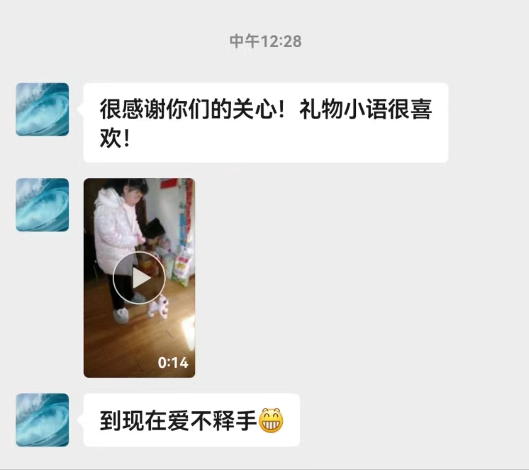 拜访结束回去的路上,我们还收到诗语爸爸录的小视频,看到视频中诗语对礼物爱不释手,我们感到很欣慰。我们和诗语的爸爸妈妈一样,相信只要我们不断用爱去陪伴,她会汲取到更多的能量,她的未来会越来越值得我们期待。心守暖阳,静待花开。
