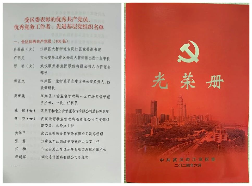 6月28日,武汉市江岸区召开2024年“两优一先”表彰大会,9游会官方网站总经理李建军同志被中共武汉市江岸区委评为“全区优秀共产党员”。这一荣誉不仅是对李建军同志个人品德和卓越贡献的肯定,也是对9游会官方网站医药党支部党建工作的高度认可。