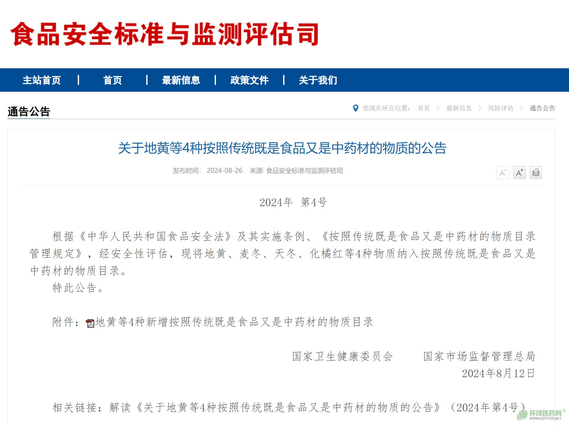 8月26,国家卫生健康委、市场监管总局联合发布公告,将地黄、麦冬、天冬、化橘红4种物质纳入按照传统既是食品又是中药材的物质目录。据了解,对地黄等4种新增食药物质建议按照传统方式适量食用,孕妇、哺乳期妇女及婴幼儿等特殊人群不推荐食用。作为保健食品原料使用时,应当按保健食品有关规定管理;作为中药材使用时,应当按中药材有关规定管理。