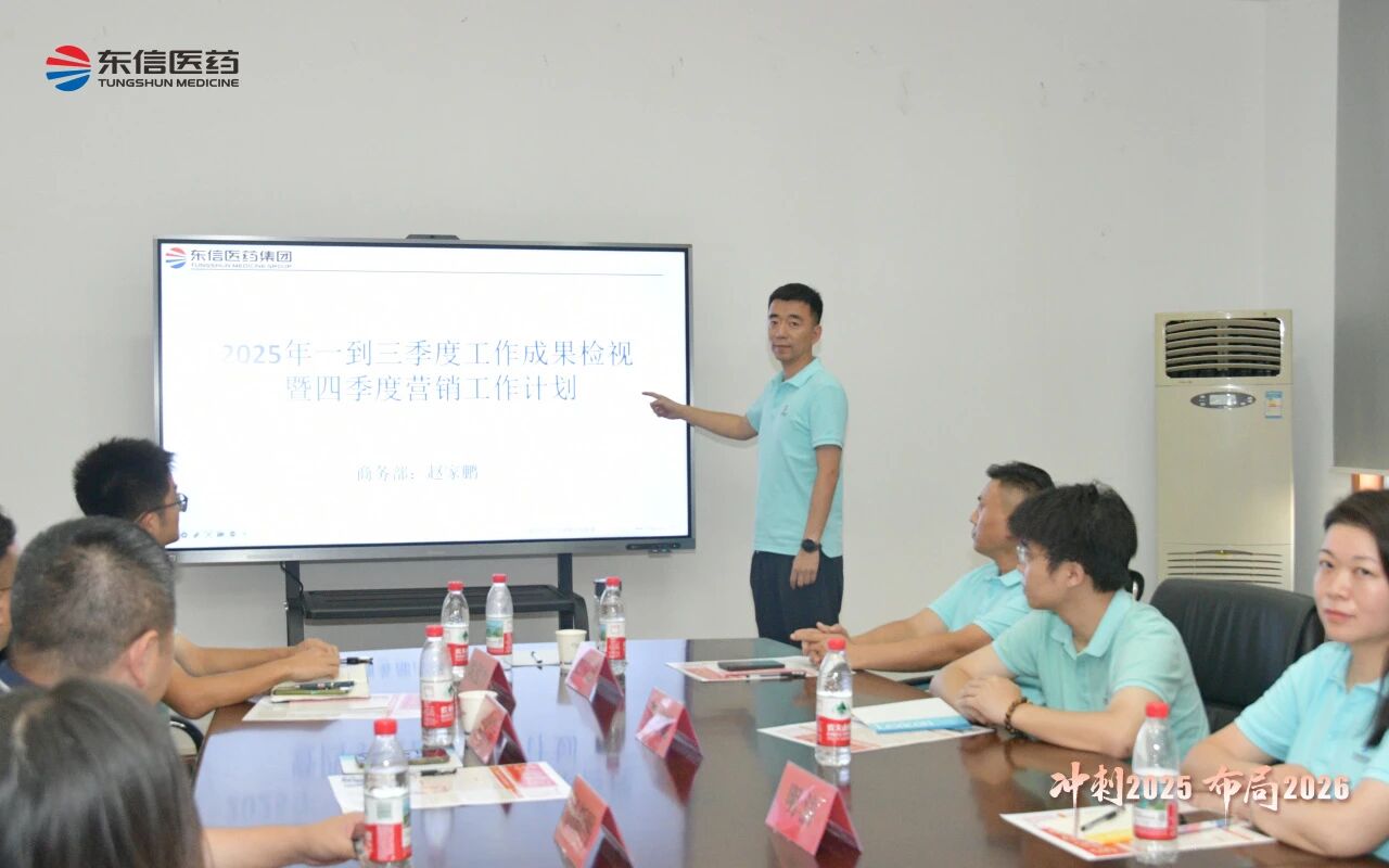 销售总监张湘文全面总结销售部前三季度的业绩达成情况,并针对多项重点工作提出具体要求:一是确保完成四季度任务目标;二是稳步推进五大工程落地;三是有序开展秋季PK活动;四是推动区域重点产品实现深度突破;五是加大OTC产品推广力度;六是落实省际联盟集采相关工作;七是科学制定2026年销售计划。