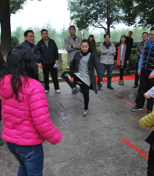 首先进行的是“好运传送——集体踢毽”。这个项目每队各出6人,队员之间互相配合将毽子踢给队友。比赛项目非常考验团队的协调性和配合性,经过每队各5分钟的紧张比赛,“超人队”以踢毽数最多赢得比赛。