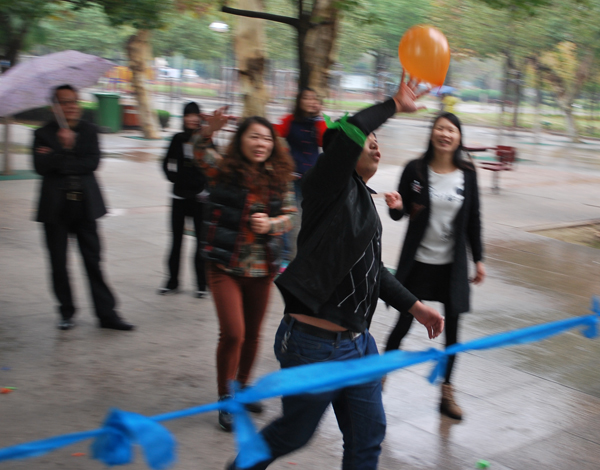 接下来进行的“沙滩气球”正如项目名称一样充满了激情和乐趣。在绵绵细雨和凉爽的秋风中,气球完全不听比赛双方队员的控制,忽疾忽缓,忽高忽低,给双方增加了不少难度,也给围观的同事带来了阵阵欢乐。经过11分制三局两胜的淘汰赛和PK赛,“梦想队”牢牢地掌握着主动,发挥出色,赢得了本届运动会最具趣味性项目的冠军。