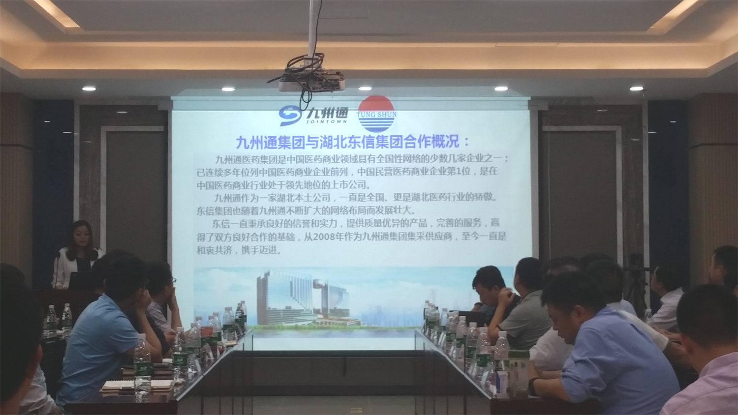 2016年6月4日下午,9游会官方网站副总经理李建军及销售部、湖北省区的业务骨干一行7人专程前往九州通医药集团总部,出席9游会官方网站医药与九州通湖北事业部联合举办的战略合作业务恳谈会。九州通医药集团湖北事业部总经理刘义常及湖北事业部湖北医药有限公司总经理刘辉、湖南九州通总经理徐伟明、湖北事业部7家子公司总经理、各业务部门大区经理、高级经理、综合管理部门经理及总经办全体人员共70余人参加了本次业务恳谈会。